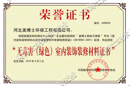 美博士經(jīng)國家建筑材料測試中心,企業(yè)委托檢測的“美博士納米貝殼粉”符合《室內(nèi)裝飾裝修材料水溶性墻面涂料中有害物質(zhì)限量》(GB18582-2001)標(biāo)準(zhǔn),中國建筑材料裝飾裝修材料協(xié)會(huì)于2016年6月2日特此頒發(fā)了“無毒害(綠色)室內(nèi)裝飾裝修材料證書”